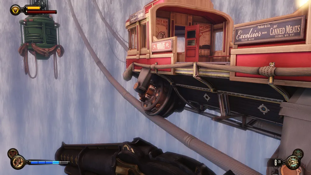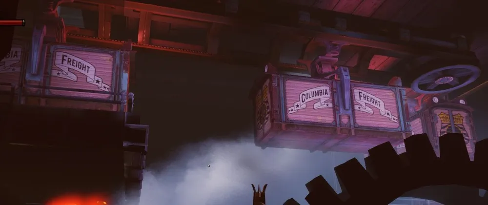 А вот грузовые вагоны подвесной дороги подвешены под рельсом, да и сам Букер, когда передвигается по небесной дороге, висит под рельсом.