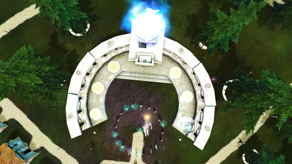 Схема алтаря состоит из нескольких интерактивных частей. В центре на площадке будут молиться верующие и проводить обряд, напоминающий «Зикр». Как и с другими видами деятельности, вы можете «вдохновить» людей стать верующими, обычные горожане будут присоединятся к молитвам в свое свободное время. Молящиеся генерируют для вас энергию (ману). В центре на вершине алтаря расположена чаша с голубым пламенем. В данную чашу вы можете приносить в жертву живых существ ради мгновенного получения определенного количества маны. За каждую жертву вы будете получать очки «зла», прямо пропорционально количеству маны. Список возможных жертв, следующий: