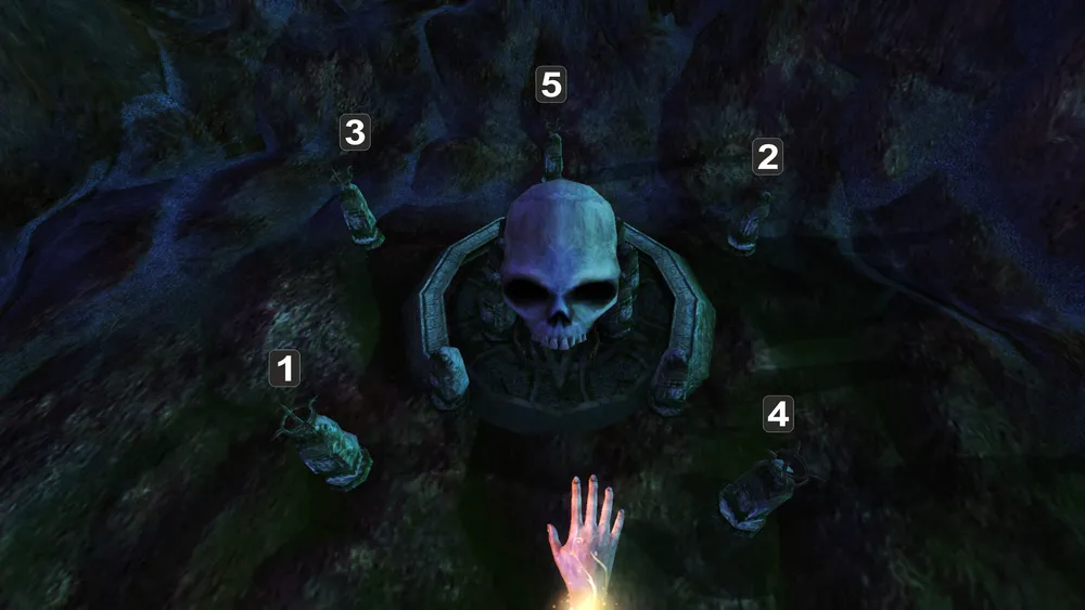 5. Призрачные воины. Еще один дополнительный квест находится недалеко от стен вражеской столицы. На небольшой площадке вы можете увидеть череп и пять «жаровен». В данном месте по ночам появляется серебряный свиток. В этом задании нужно решить головоломку. Жаровни являются надгробиями. При наведении длани на одну из них вы можете увидеть имя и год смерти. Также, если кликнуть на жаровню она загорается. Чтобы решить головоломку нужно зажечь жаровни по порядку дат смерти, от самой старой до недавней.