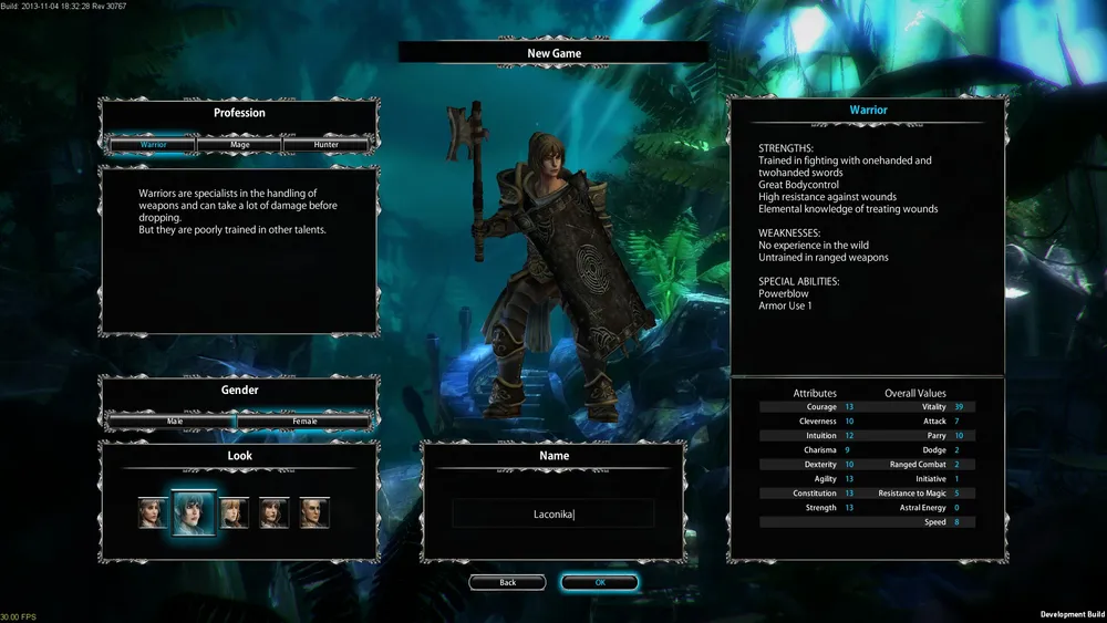 Начинается все с выбора героя. Свободы особой нет - дают выбрать один из трех классов (воин, маг или вор(охотник), влияет на стартовые значения параметров и способностей), пол (ни на что не влияет) и одну из пяти вариантов голов. Мое первое прохождение было персонажем мужского пола, но для второго я выбрал женского - у мужского отвратительная озвучка.