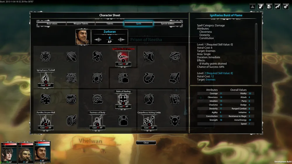 Заклинания. Ограничения по школам в ролевой системе нет, волшебник может выучить любое заклинание. Так же как и таланты имеют 4 уровня, но получаются они на 1, 8, 12 и 16 купленном скилле. Условно заклинания можно разделить на три типа: нанесение прямого урона врагам, наложение положительных эффектов на союзников (включая лечение) и наложение отрицательных эффектов на врагов.