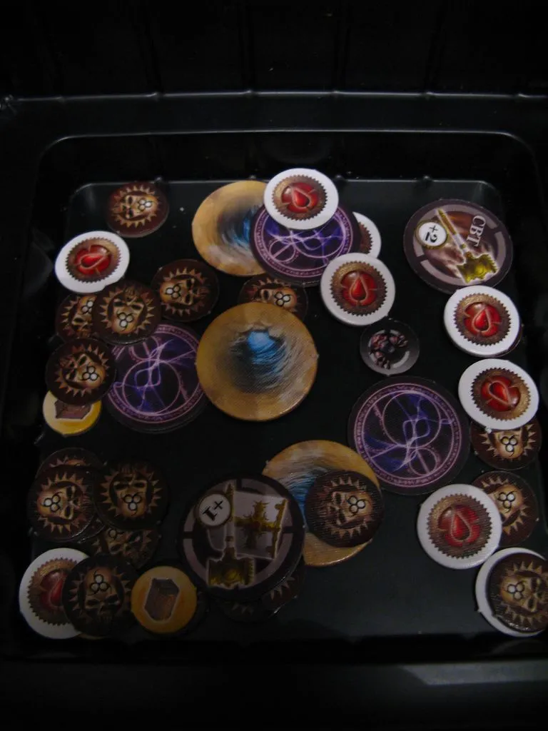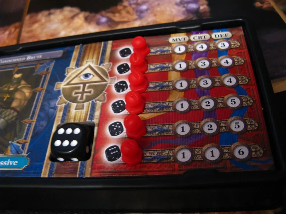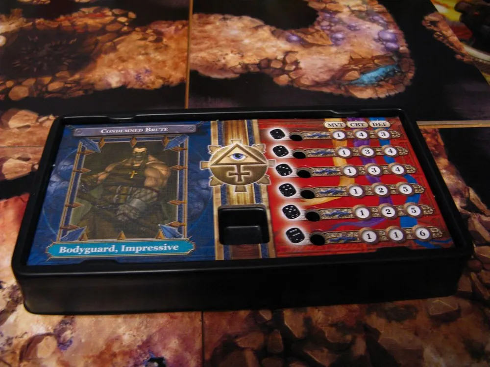 Они выполнены из того же материала, что и тайлы, а подставка из довольно тонкого пластика. По началу он кажется так себе, но потом привыкаешь и ничего. В эту конструкцию во время игры помещается кубик (видно на картинке) и маркеры ран.