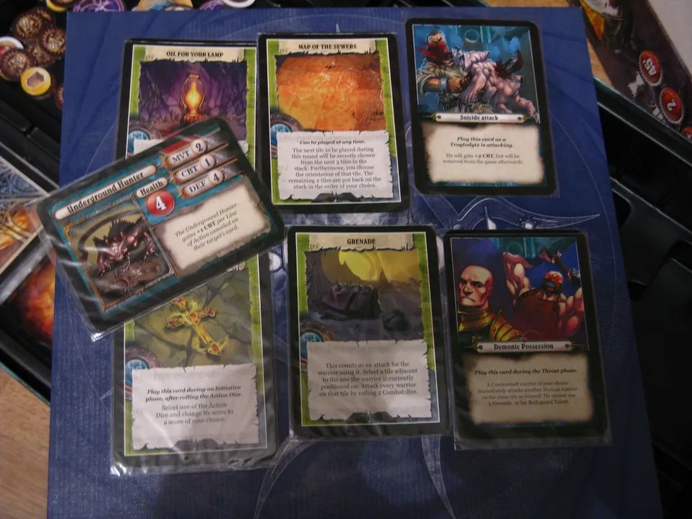 Карт в игре всего 50 штук. Они стандартных размеров (аналогичны картам в MTG, Крагморте, Манчкин Квесте и т.п.) и превосходно размещаются в протекторах (о сложностях складирования карт в коробке я писал выше). Материал карт так же аналогичен стандартному качественному материалу карт в других играх. Оформление - на 5, рисунки - на 5 (мне вообще очень понравился некоторый "комиксовый" стиль рисунков игры). Даже рубашки отличные! Самих типов карт несколько, каждый используется в своё время и отражает различные аспекты игры: