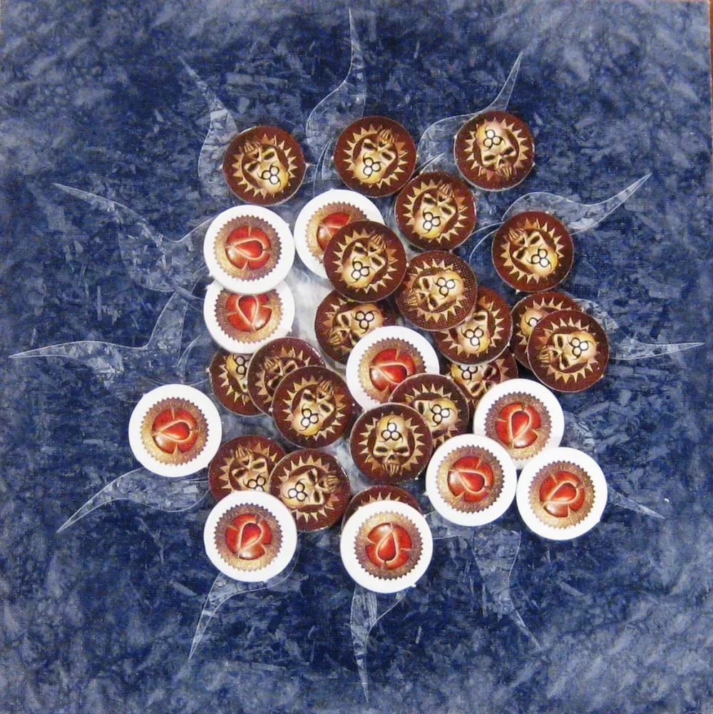 Это большие квадраты из плотного картона, который напоминает оргалит, с очень красивым и качественным рисунком на них. Собственно большая часть веса коробки - именно тайлы. Да и игровое поле - тоже тайлы. Очень приятные в использовании квадраты, да и долговечные весьма. Но все же нашлась и ложечка дёгтя, точнее 2: