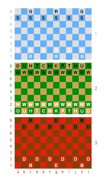 Вместо обычных фигур у нас фантастические существа. В небе - сильфы, грифоны и драконы. В подземном мире - василиски, элементали и дварфы. На средней доске - более-менее нормальные армии.