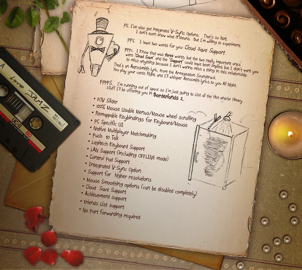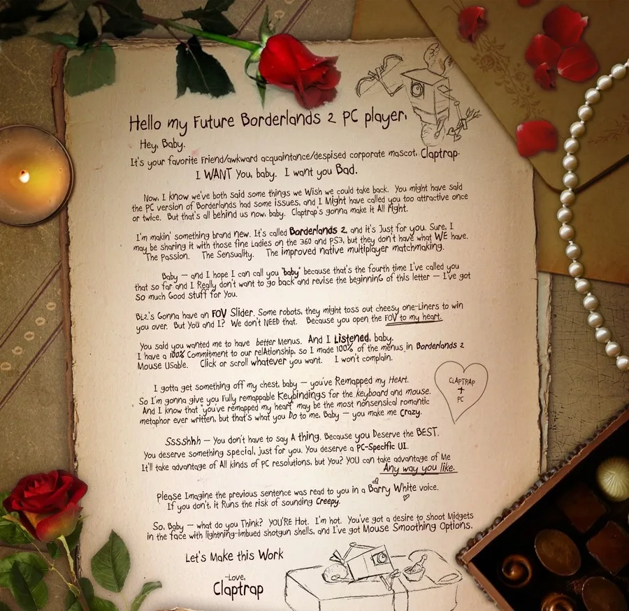Ни для кого не секрет, что версия Borderlands 2 для ПК будет отличаться от консольных. Но рассказать об этих отличиях разработчики решили не совсем обычным образом. На офицальном сайте игры появилось любовное письмо будущим ПК-геймерам Borderlands 2 от робота Claptrap.