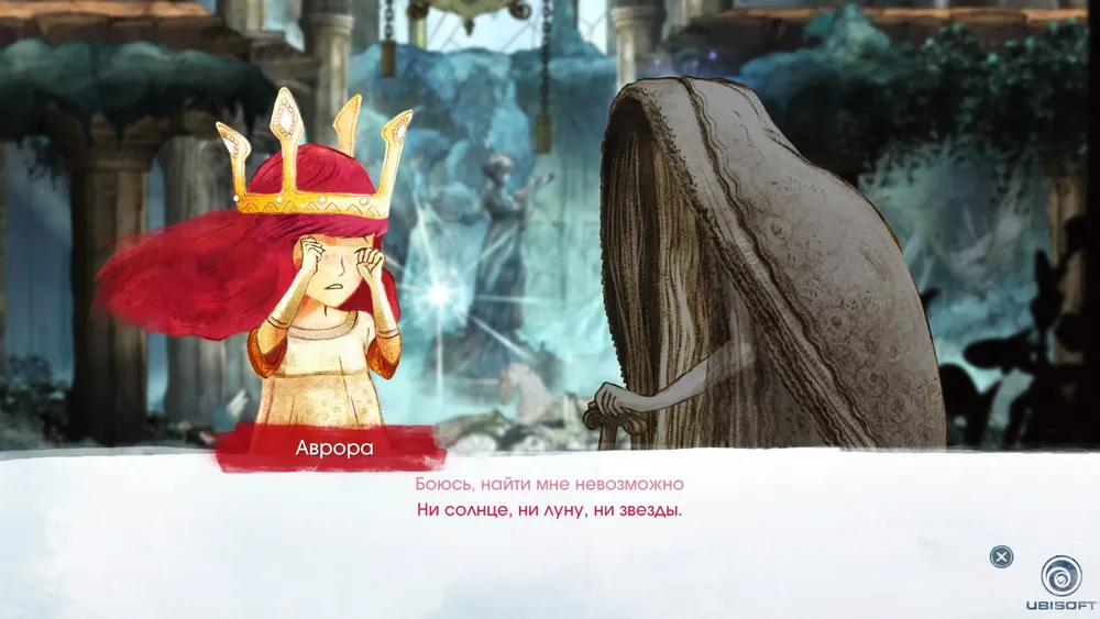 Четвертое, в игре присутствуют мелочи, конкретно в моем случае добавляющие ей лишнюю толику притягательности, очарования или просто улыбнувшие. Коробочное издание выпускалось для европейского рынка, завоз в Россию, как я уже сказала, изначально не планировался, но проблем с регионлоком или локализацией не возникло. За забугорный ключик мне досталась полностью руссифицированная версия. Кому как, а для меня это был приятный сюрприз и лишний плюс к респекту издателю, которого последнее время что-то стало модно ругать. Далее, Дитя света оказалось весьма щедрым на "юшки" - этакий аналог внутрисервисной валюты в Uplay. Выдаются они за открытие определенных внутриигровых достижений и могут быть потом потрачены на всякие внутриигровые же бонусы: дополнительные наборы ресурсов и боеприпасов, эксклюзивные предметы снаряжения и экипировки, обои для рабочего стола, побочные мини-квестики и т.д. Может, это и глупо, но "юшки" я, по возможности, собираю. Еще понравились текстурки для Авроры, прилагавшиеся к Deluxe Edition. Черно-белое платье и особенно пепельные волосы как-то сами собой вызвали ассоциации с пепельноволосой мечницей из другой "сказки", между прочим тоже августейших кровей. И, конечно же, повеселили (ну и почертыхаться тоже заставили, не скрою) многочисленные сундуки с лутом, запрятанные по локациям в самых неожиданных местах, и летающие по поднебесью и под потолком чертогов записочки. Юбики, они же такие Юбики... :))) Без сундучков и записочек никак. Собирали мы их в Ассасинах, теперь вот и в Дитёнке света можно пособирать.