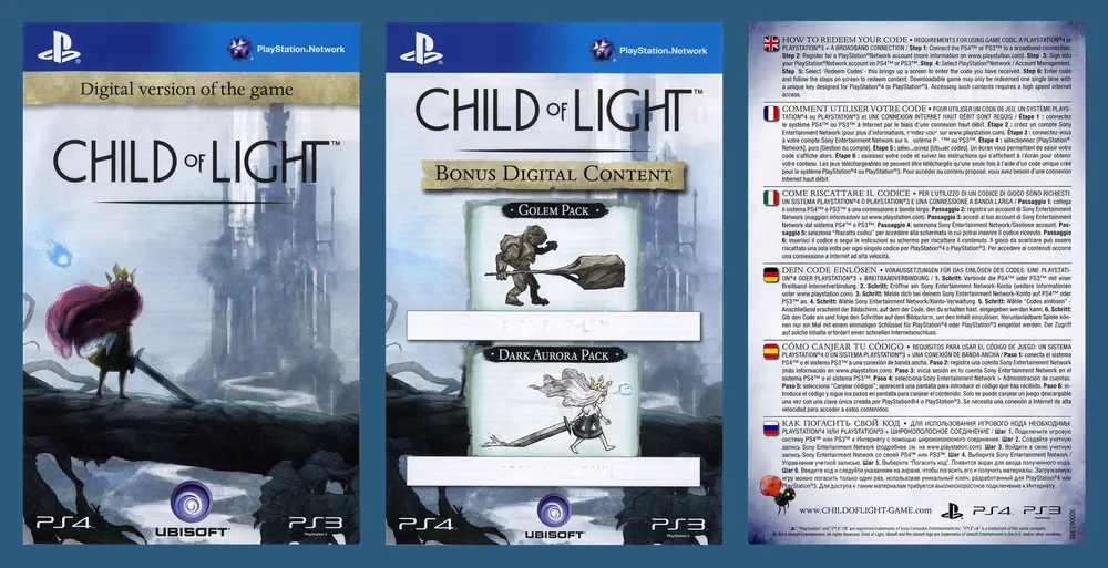 Листовочки с кодами самые обыкновенные. Одна с кодом на саму игру, другая с кодами на DLC - сюжетное, добавляющее Авроре еще одного спутника (Голема) и еще один побочный квест, и текстурное, "переодевающее" героиню в черно-белое платье и "перекрашивающее" ее волосы в пепельный цвет. Коды едины для обоих заявленных поколений плоек. При их активации PlayStationStore автоматически определяет, какую именно версию качать - для PS3 или PS4. В остальном же ничего примечательного в листовочках нет.