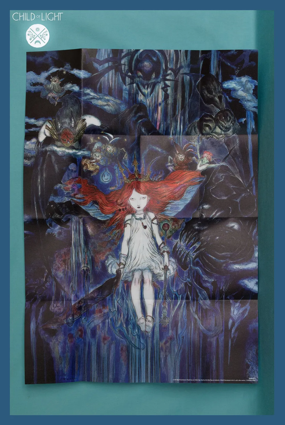Плакат представляет собой арт от Ёситаки Амано, хорошо известный тем, кто следил за новостями по Child of Light. Отпечатан он на плотной бумаге, фактурой напоминающей акварельную. Однако при всем его очаровании, плакат не избежал печальной участи многих из своих собратьев - быть сложенным в н-дцать раз. На мой взгляд, это сущее варварство - портить прелестные изображения линиями сгиба. Лучше уж вообще обойтись без них. А если все же вкладывать их в коллекционки, то свернутыми в рулоны и при условии, что размеры постера и коробки позволяют это сделать.