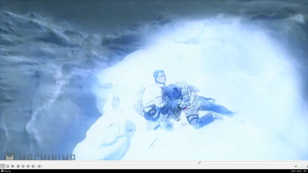 И потом наш герой, поддерживая своего тяжелораненого второго пилота, получившего пару пуль из крупнокалиберного пистолета, и истекающего кровью уже пару часов, да, никак не желающего помереть, выбирается на вершинку пригорка, где торжественно достает из кармана (интересно как он там поместился и не сломался), длинный спасательный зонд-маяк, включает и втыкает его в лед!!! Ооо… И тут же через несколько минут на помощь им с другого конца галактики прилетает спасательная команда!!! Да, наши своих не бросают! Удивительно, вся звездная система кишит сайлонами, но на помощь им тут же прилетает небольшой корабль и забирает их с планеты.