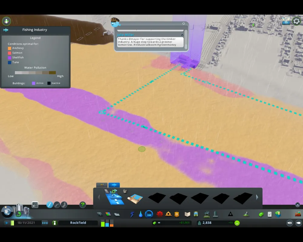 Во-первых, разработчики добавили «рыбную индустрию». Причём здесь и рыболовство, где вы проводите курс для рыбацких лодок через наиболее богатые места (и подальше от сточных вод). И рыбные фермы, тоже чувствительные к загрязнению.