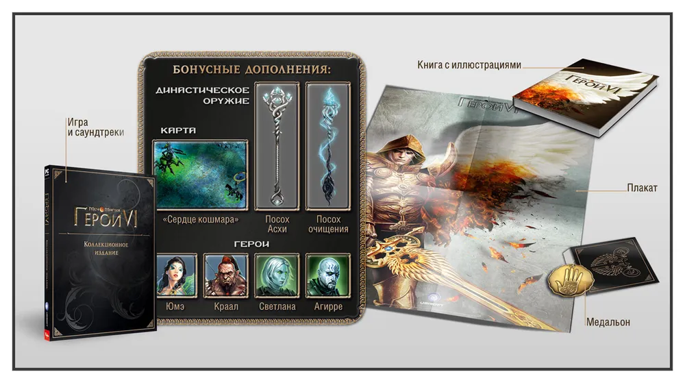 • бонусные дополнения: герои (Юма, Светлана, Краал и Агирре), карта "Сердце кошмара" и артефакты (Посох Асхи и Посох очищения)