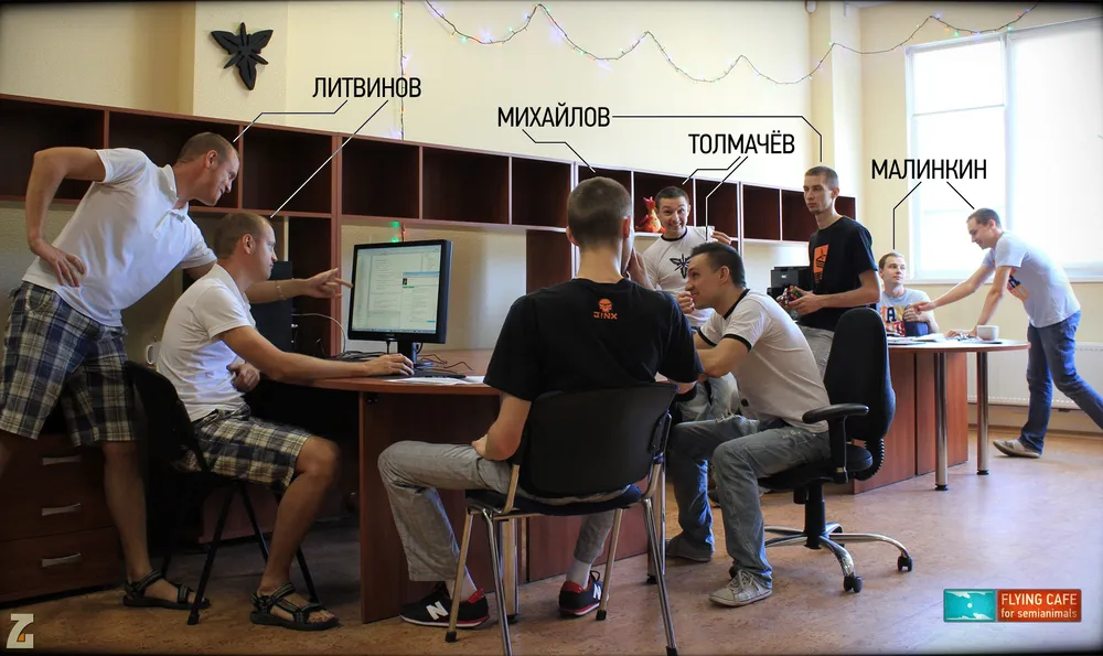 — Здравствуйте. Наша команда — четыре человека. Роман Малинкин (моделирование, анимации, технический дирекшн), Евгений Литвинов (программирование), Павел Михайлов (тексты, геймдизайн, скриптование игровой логики), и я — Илья Толмачёв (сценарий, арт-дирекшн, менеджмент). Будем знакомы.