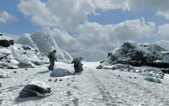 Человек в нанокостюме белой расцветки махает транспортнику. Перед ним проходит граница ледовой корки. С одной стороны зелёная трава, с другой заледенелая поверхность. На траве крупным планом показан мотылёк, покрытый инеем; по крыльям стекают капли - мотылёк заледенел на одной стороне и, упав, оттаивает на другой.