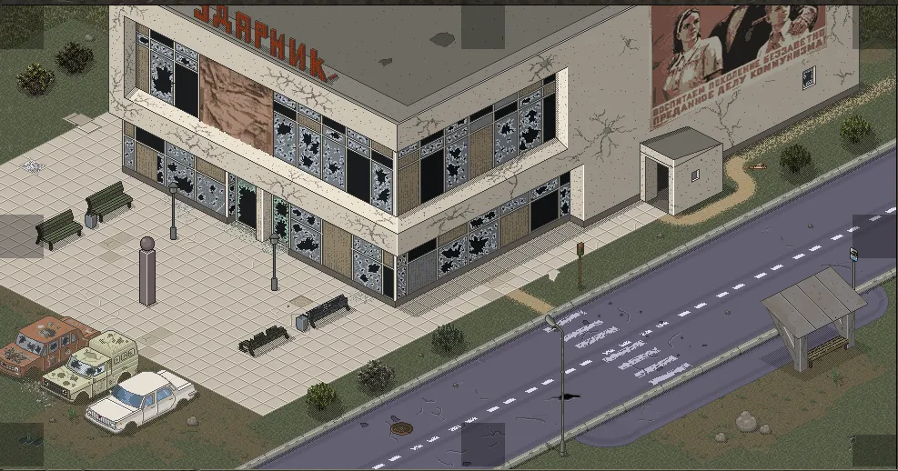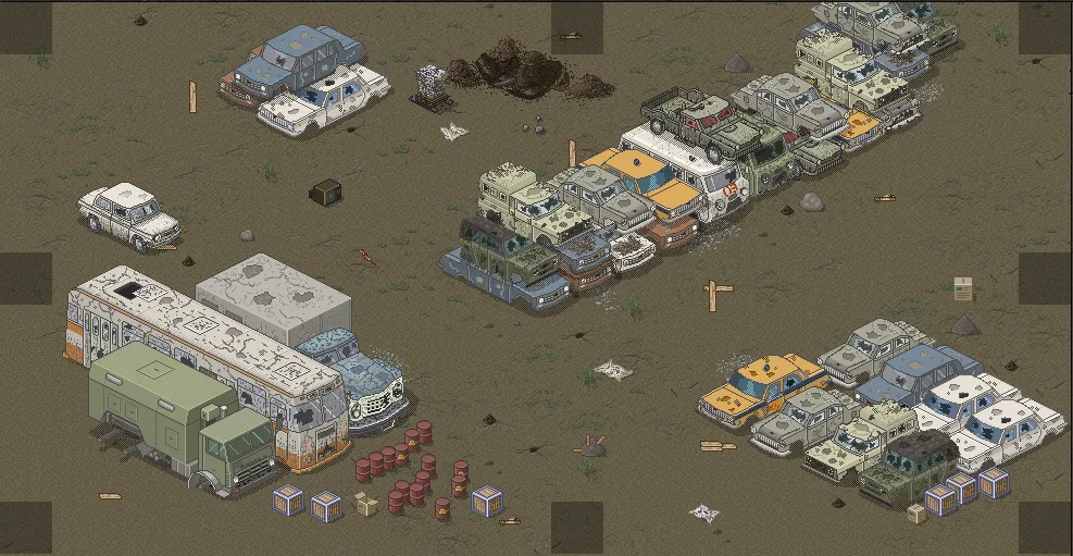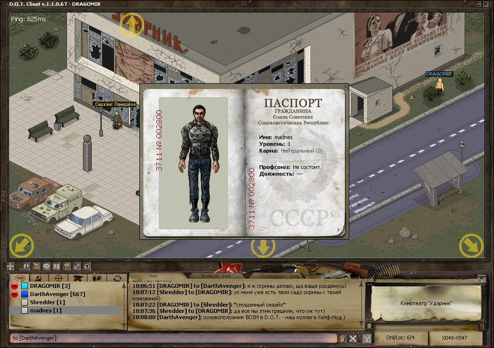 Скриншоты бета-тестируемой игры D.O.T. в стиле pixel art, включая интерфейс персонажа и локации города 3711, такие как котельная, железнодорожные пути и завод "Красный Октябрь".