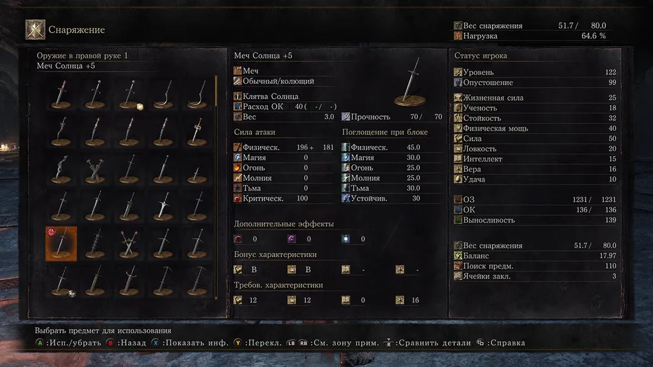 В завершении хочется сказать следующее: в 3 части акцент сместился на быстрое одноручное оружие, т.к. скорость атак мобов стала реально выше. Поэтому, пока ты замахиваешься медленным сильным оружием, они тебя уже могут прибить. Плюс станить противника часто проще именно быстрым легким мечом. Однако это не отменяет другие классы оружия, и в целом можно порекомендовать некий «минимальный» набор оружия, необходимый для прохождения игры, исходя из того, что в основной игре мы можем найти 6 кусков титанита, а седьмой купить у Служанки в Храме, после того, как все 4 пепла боссов окажутся на своих тронах (т.е. перед финальной битвой).