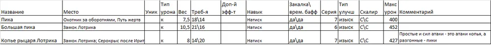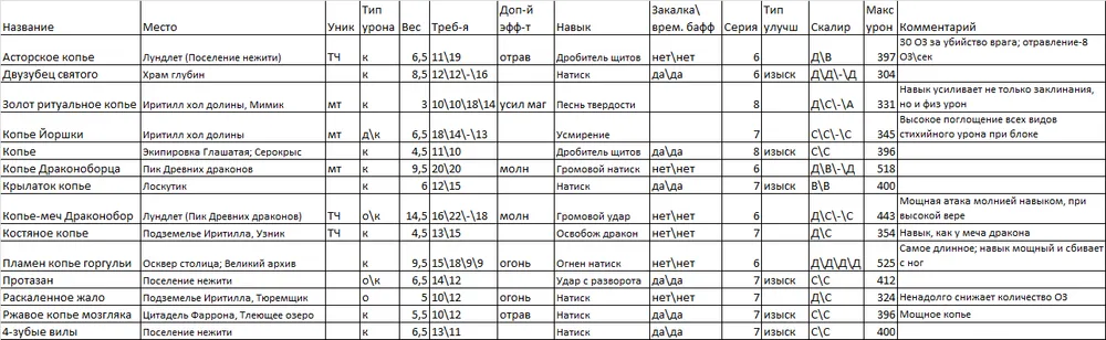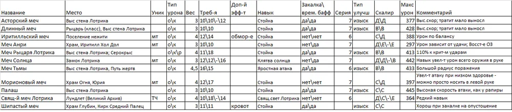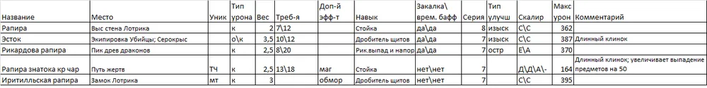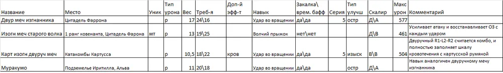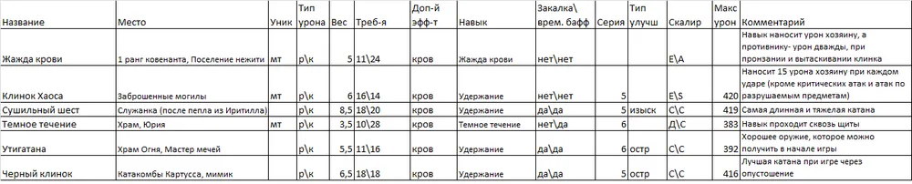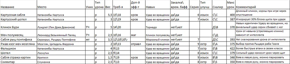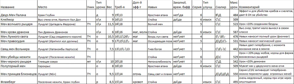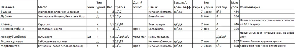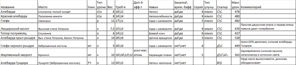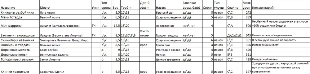 Я выделил парное оружие в отдельную таблицу, т.к. мне кажется, что это отдельный специфичный класс. Я им не играю, но клинки Хранителя и Топоры Крылатого рыцаря показались мне весьма интересными, ибо именно от их обладателей я хорошо получал очень много раз…
