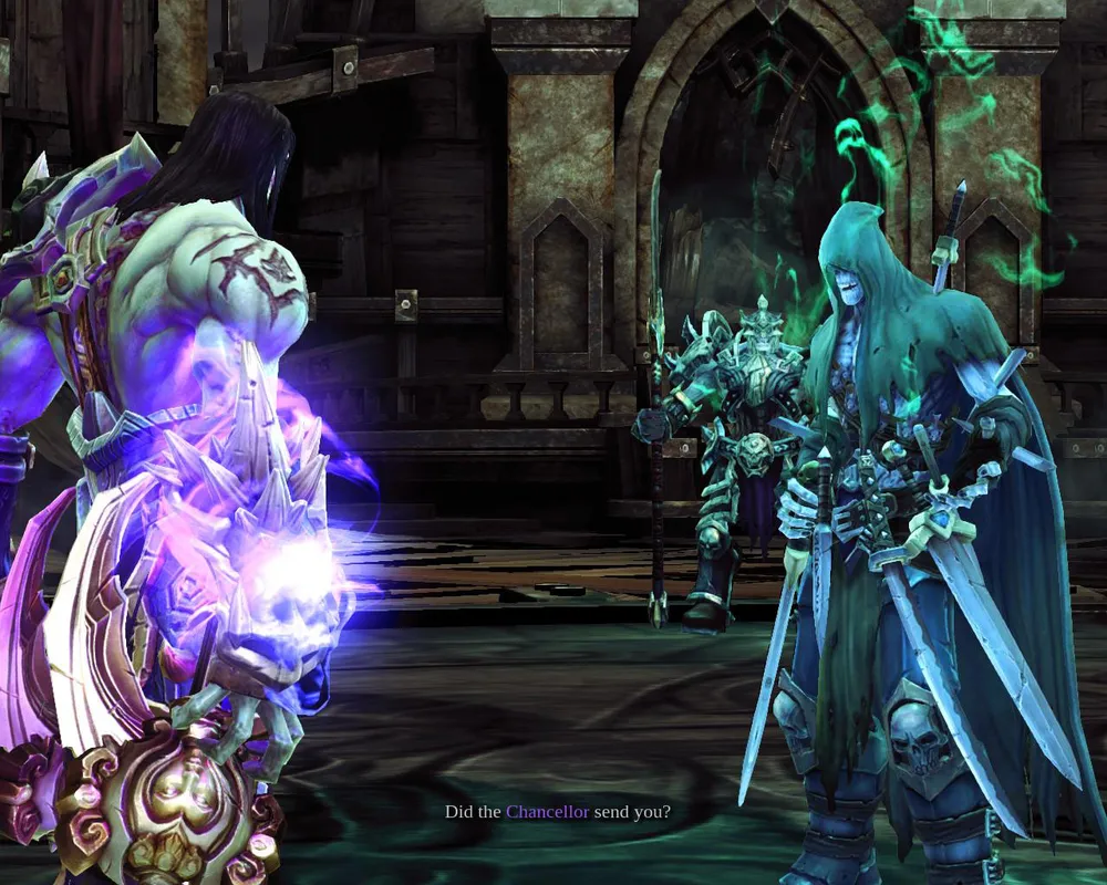 Итак, пока бронированный Война пытается разобраться в причинах преждевременной гибели всего человечества, новый герой, Смерть, намеревается реабилитировать брата и возродить безвременно почивший род людской. Сюжет здесь, впрочем, весьма условный, и получив краткую вводную от очередного ключевого персонажа, Смерть с головой и надолго погружается в проблемы помельче – как добраться вон к тому уступу и как порешить вон того босса. Не спорю, в игре прибавилось диалогов, и с некоторыми NPC можно обсудить их прошлое и настоящее (просто перебирая доступные темы разговора), но в глобальном плане они ничего не значат и служат лишь для придания целостности окружающему миру.