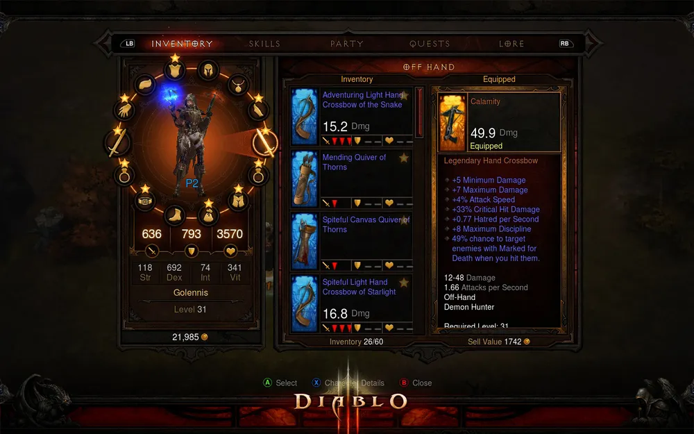 Подбирать выпавший шмот несложно (даже чуточку быстрее, чем в PC-версии, по моим ощущениям), а экипироваться можно буквально одной кнопкой. Правда, окно сравнения статов реализовано немного по-другому: вместо количественных показателей в консольной версии есть стрелочки, которые показывают, улучшает ли выбранная вещь урон, здоровье и защиту. Чем больше стрелочек, тем больше разница между вещами, хотя, разумеется, вам никто не мешает сравнить статы в окне характеристик персонажа.