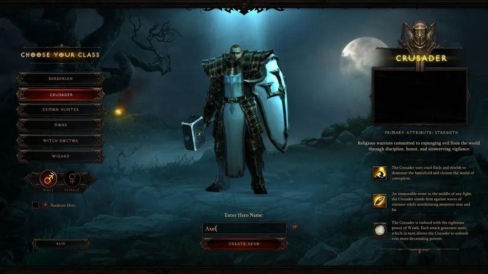 Изначально Крестоносец задумывался как темный вариант Паладина из Diablo II, но, как часто случается, в процессе девелопмента класс претерпел изменения и вышел из-под пера ведущего дизайнера Кевина Мартенса [Kevin Martens] эдаким гибридом паладина, спартанского воина и непробиваемого танка, Тем не менее, ему присущи все черты классического архетипа. Это рыцарь самых строгих правил, типичный lawful good, защитник униженных и оскорбленных. Он предпочитает ходить в консервной банке с опущенным забралом и размахивать дубиной с большим набалдашником; от пороков и разврата прикрывается щитом, им же и наносит тяжкие телесные повреждения, несовместимые с жизнью. В арсенале имеется магия Света, которой тот умело причиняет добро. Характер нордический, выдержанный. Беспощаден к врагам рейха Закарума. В общем, без долгих церемоний, приветствуйте – это Паладин!