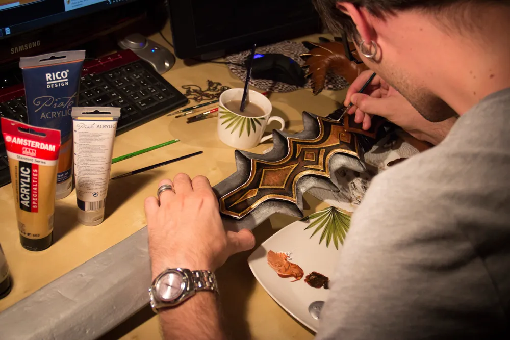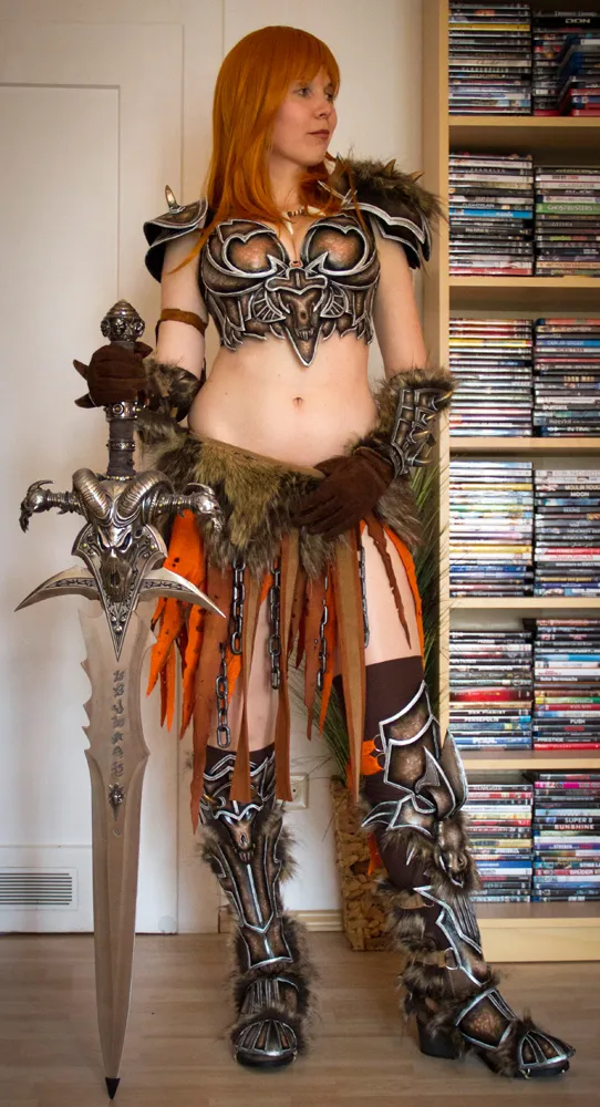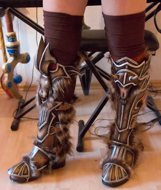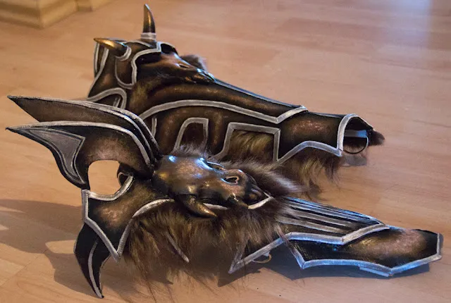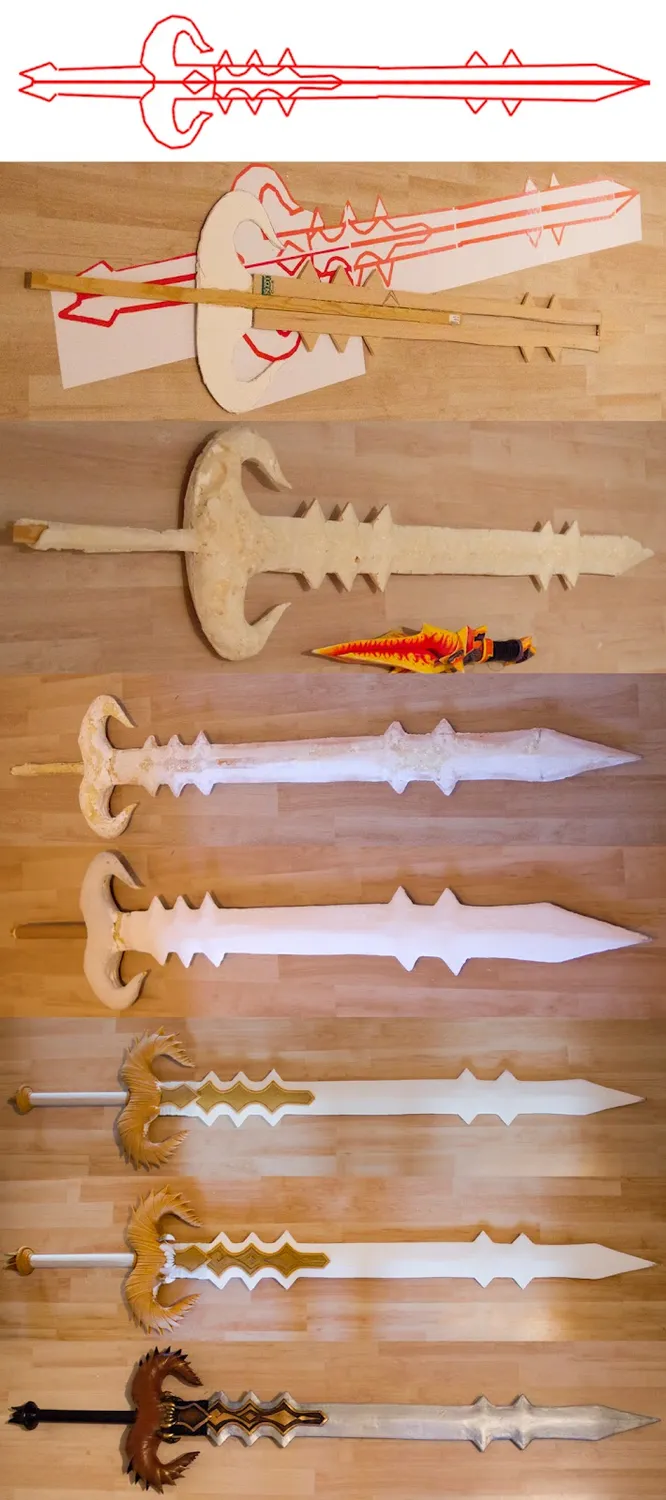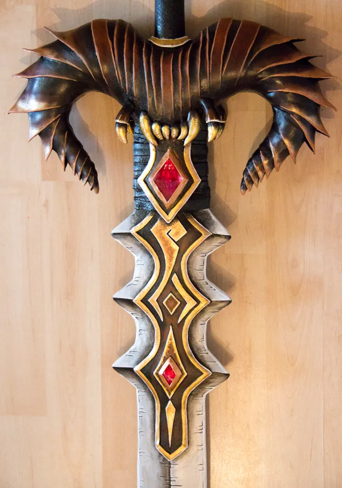 Надеюсь вы понимаете, что сделать меч было не так трудно. Я использовала деревянную основу, разные формы предавала с помощью монтажной пены, заделывала щели акриловой пастой, лезвие обила Wonderflex'ом. Всего три дня, не больше и не меньше.