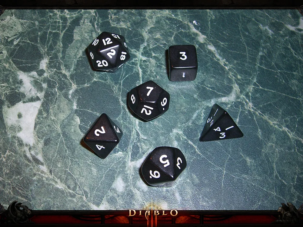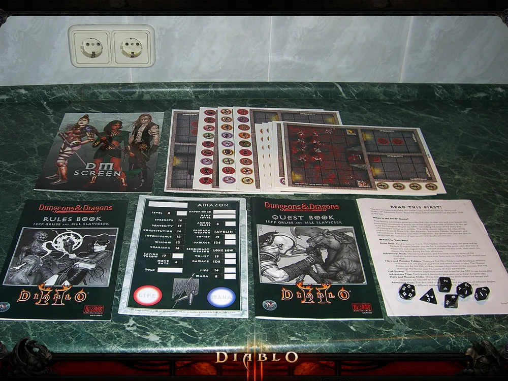 В ролевую игру по мотивам Diablo входит все, что нужно классическому приключенцу. Там есть книга квестов и книга правил, в которых расписаны варианты сражений, правильность ходов и прочие полезные моменты. Есть листки персонажей с распределенными параметрами (поклонникам Варвара: увы, харизма у него только 10. Впрочем, интеллектом и мудростью он тоже особо не блещет..). Есть карты подземелий, куда партия может спуститься в поисках сокровищ и приключений, есть и бестиарий (аве Падшим и крысоежикам!). Blizzard так воодушевились, что даже вложили в игру специальный комплект дайсов. Это шесть разнокалиберных кубиков, которые нужно бросать постоянно: вычисление наносимого урона, проверки, штрафы и так далее - все вопросы решают великие кубики d4, d6, d8, d10, d12 и d20. Число в данном случае - это сколько граней у кубика и, соответственно, сколько вариантов раскладок вам может выпасть.