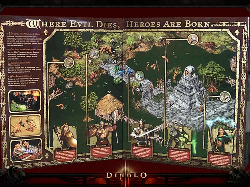 В мануале кроме стандартных описаний для новайсов ("Ходить туда, кушать тут, спать там, тыкать здесь!") есть приличное количество внутриигровой информации и нехилый такой кусок истории вселенной. Нам рассказывают, откуда есть пошли наши герои, объясняют вкратце механику работы их навыков (да-да, все 150 скиллов с иконками), дают вводную по вещам и предметам. В мануале вы найдете несколько стихотворений Криса Метцена [Chris Metzen], краткую историю о том, как Хорадримы [Horadrim] ловили Триаду, а также карту Санктуария [Sanctuary] с небольшими путеводителями по природным красотам и агрессивной фауне. В общем, для любителей lore-информации подарочек что надо!