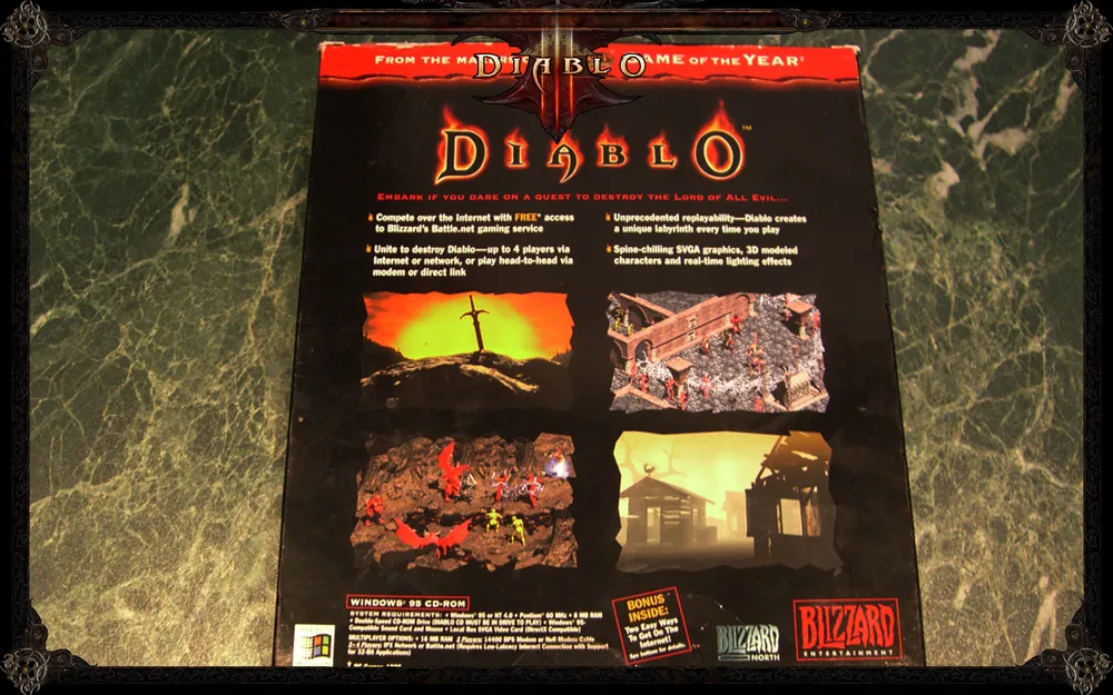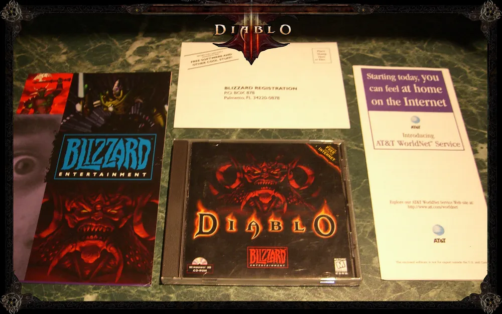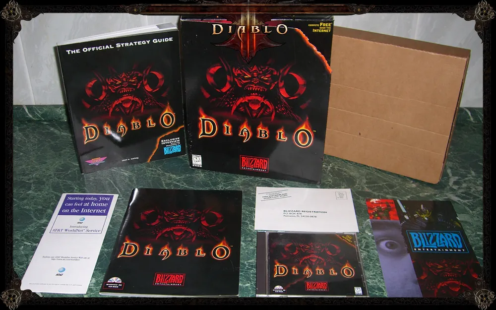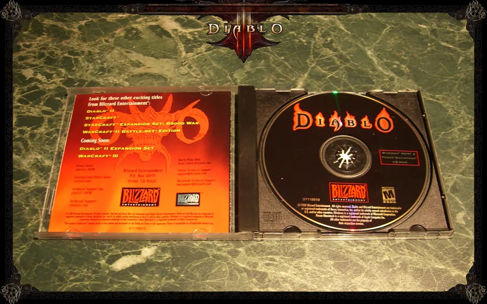 Следует отметить, что хотя Blizzard издавали несколько версий Diablo, самую большую ценность представляет оригинальный первый штатовский релиз. Поскольку изданий и переизданий Diablo, несмотря на ее возраст, хватает, я сейчас поподробней расскажу, чем он отличается от прочих и как его опознать в толпе. Оригинальное первое штатовское издание Diablo упаковано в так называемый retail-бокс (retail - это розница, но называть чудную коробку "розничным боксом".. килл ми..) 22 см в ширину и 26 см - в высоту. Отличительной чертой бокса является то, что он открывается как книжка, демонстрируя счастливому обладателю игры что-то типа дополнительного арта и небольшой сопроводительной инфы. Из разряда, знаете ли, что не все спокойно в датском королевстве. Эта коробка более "квадратная", чем ее последовательницы, и на ней нет никаких отличительных нашлепок вроде "продано в охренетительных количествах штук". Насколько я знаю, открываются как книжки только американские издания игры, европейские такой приятной участи лишены, и арт задника у них несколько другой. Про всякие джевелы и DVD-боксы я молчу, тягаться с оригиналкой им даже близко не по зубам.