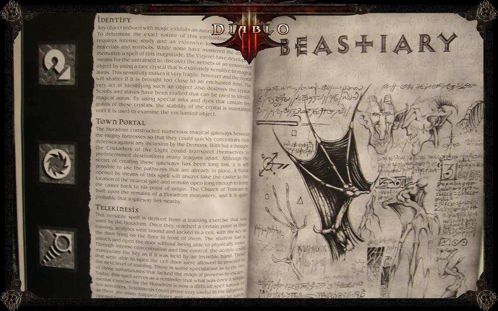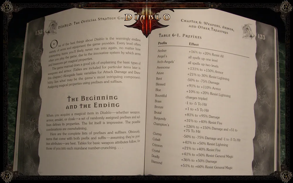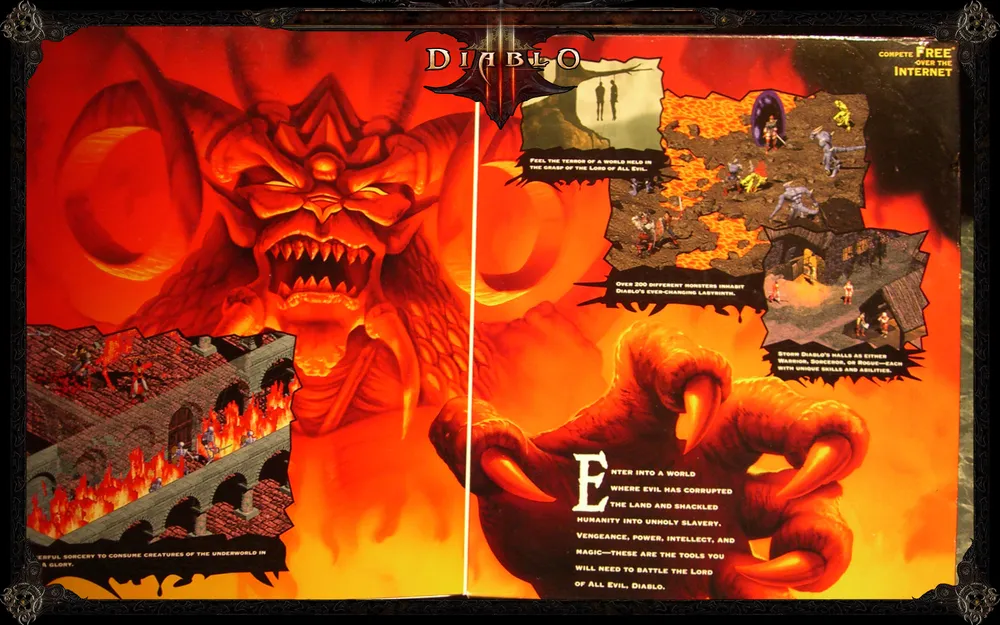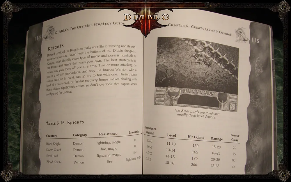 В гайде вы найдете подробные инструкции по всем аспектам игры: как выполнять задания, как играть персонажами, как сражаться в зависимости от структуры лабиринта. Там есть информация об уникальных вещах, типах монстров, NPC, сетевой игре. В общем, манчкины, эта книга для вас. Все вики-материалы по Diablo в той или иной степени опираются именно на этот гайд. Он иллюстрирован различными игровыми скриншотами, а в качестве вишенки на торте вам предлагается интервью с создателями игры, которое идет в самом конце.