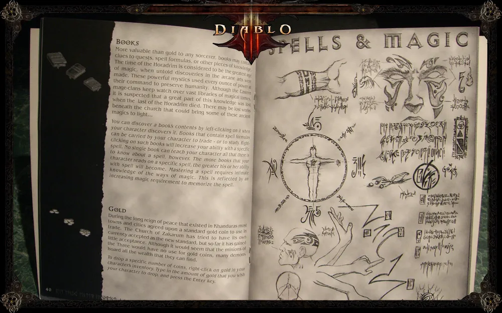 Для начала - мануал игрока. Если вы думаете, что это утлая невыразительная книжечка туалетной бумаги и сомнительных советов, - вы оч жестоко ошибаетесь! Даже базовый мануал по Diablo (который по сути своей есть инструкция геймеру) даст сто очков форы многим руководствам и гайдам. Это 80-страничный буклет человеческого формата (примерно 17.5 см на 23 см) с плотной обложкой, хорошей бумагой и отличным качеством печати (даже по сегодняшним меркам). Он черно-белый, но это его нисколько не портит. Даже украшает, я бы сказала. Мануал не только знакомит игрока с базовыми элементами Diablo, но и предоставляет читателю внушительный кусок знаний об игровой вселенной, плюс арты художников Blizzard, плюс мрачные стихи Криса Метцена и его же рисунки по истории мира. Первые три десятка страниц нам терпеливо объясняют, как пить зелья, куда втыкать свитки с заклинаниями и как ориентироваться в сетевой игре. Зато потом..