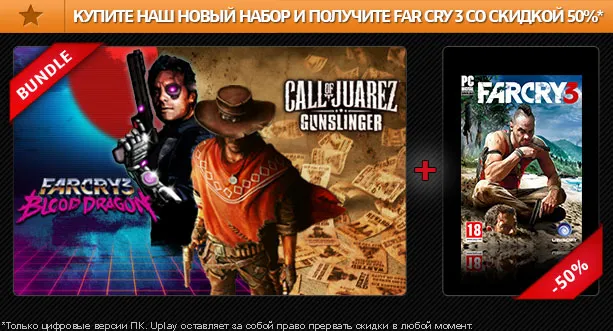 UPlay и Ubisoft не перестают нас радовать. В этот раз они предлагают геймерам купить бандл из CALL OF JUAREZ GUNSLINGER и FAR CRY 3 - BLOOD DRAGON за 499 рублей + получить 50% скидку на FAR CRY 3.