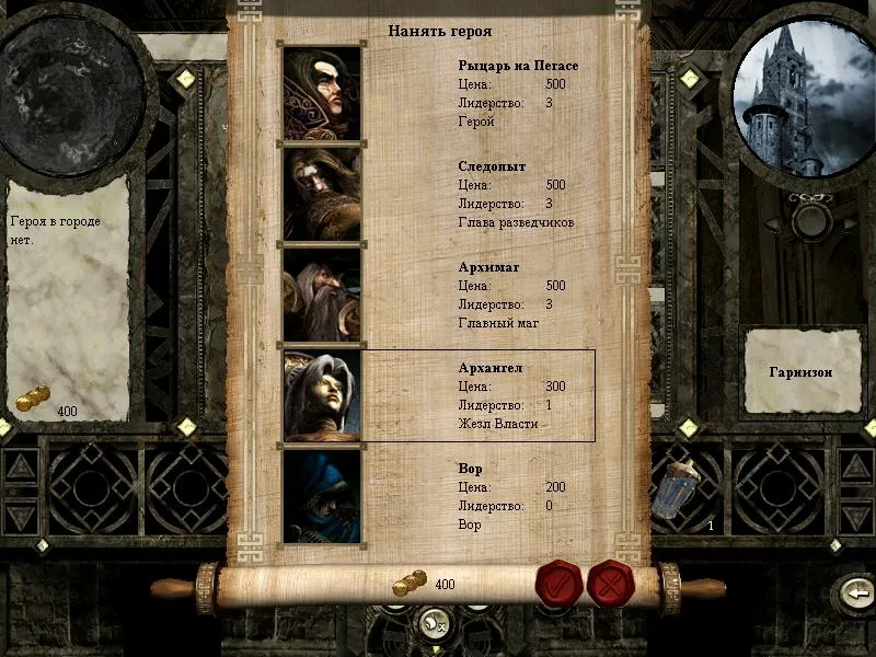 Остаётся Архангел. В отличие от боевых героев, может взять с собой только одного спутника. Зато не получает штрафов при передвижении, умеет лечить и водружать Жезлы, захватывая столь необходимые рудники. То, что нужно! Итак, решено: героем будет Архангел. Осталось определиться с лордом.