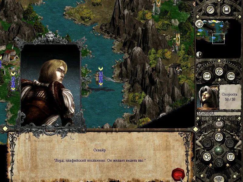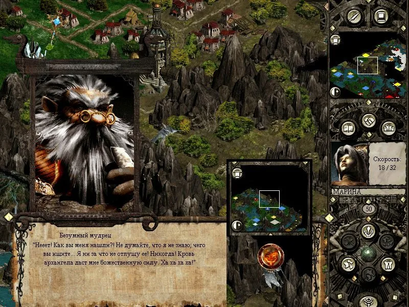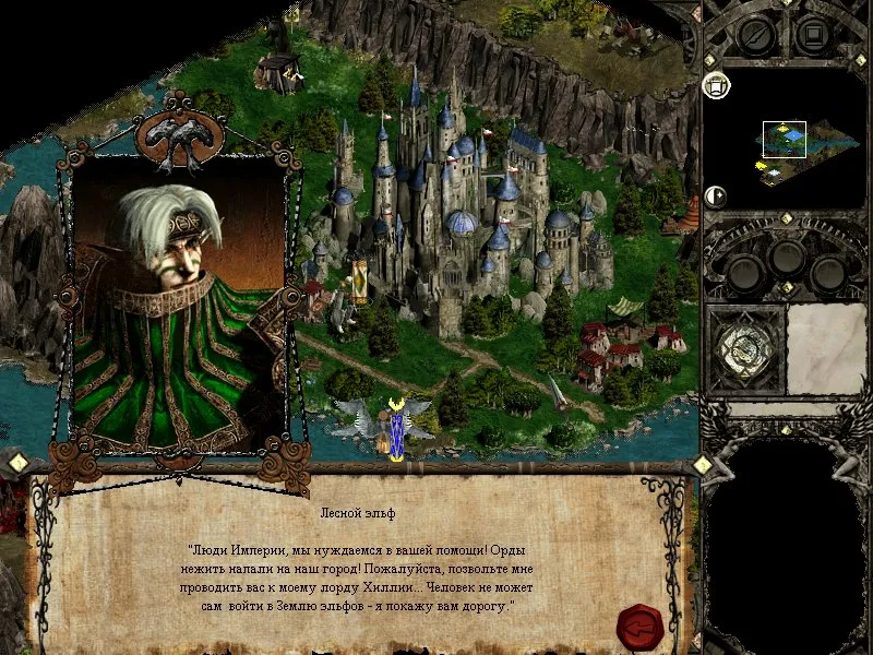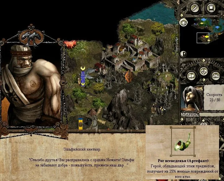 Продвигаемся дальше, уничтожаем отряд оборотней, двух титанов и подходим к магазину, в котором продаётся… заклинание гномов «Быстрота», восстанавливающее 100 % движения! Теперь наш Архангел сможет выиграть шесть боёв за день, хватило бы маны. Продолжаем движение на запад, пока в самом углу карты не находим одинокого эльфа.