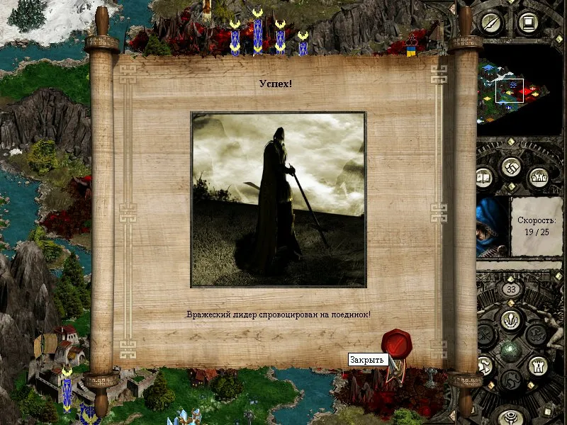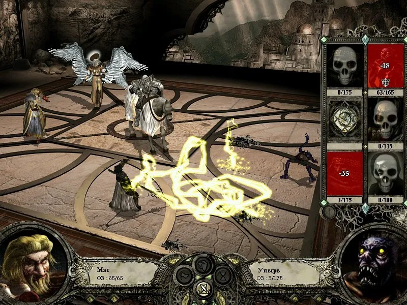 Можно приниматься и за главного злодея, приготовившего нам сюрприз: сначала на бой с вашим героем выйдет отряд вассалов, предварительно скастовав заклинание ослабления. Никаких проблем – вышлем впереди себя оживший доспех, он и примет проклятие. Если накопилось достаточно маны, можно попотчевать врагов «Армагеддоном» и другими полезными заклинаниями.
