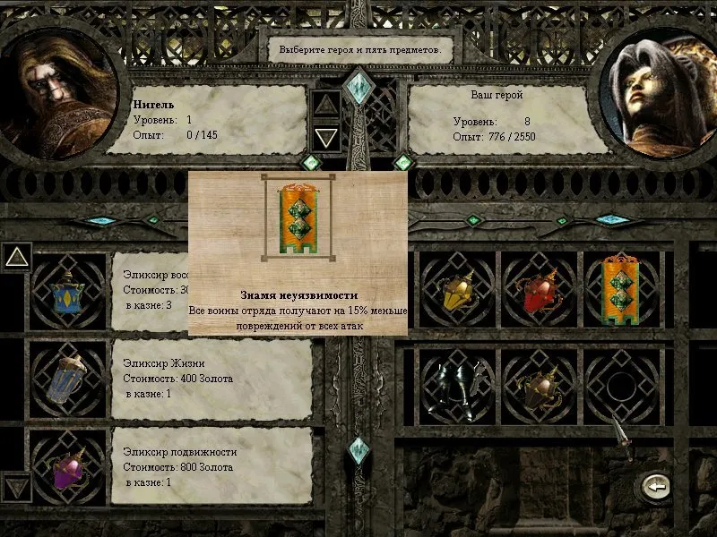 Что берём с собой? Сапоги-скороходы, эликсиры защиты, силы, и точности. Знамя неуязвимости тоже берём! Откуда оно взялось? Я же предупреждал, что нужно обшаривать всю карту! Ищите и найдёте! Если враг не опередит…
