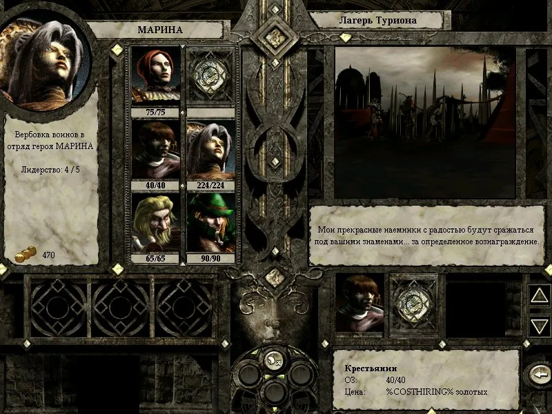 У выхода из крепости обнаружился лагерь наёмников с уникальными бойцами – крестьянами. Почему бы не нанять одного? Зачем нужен боец с сорока единицами жизни и двадцатью единицами атаки? Погодите, увидите!