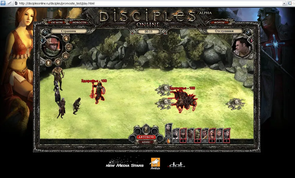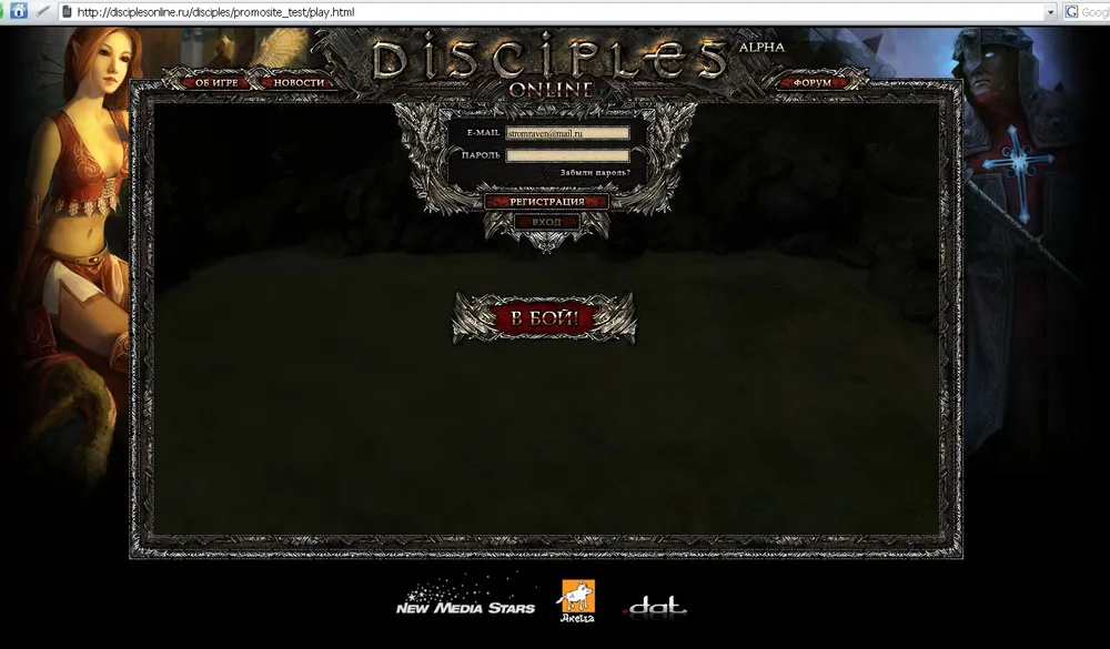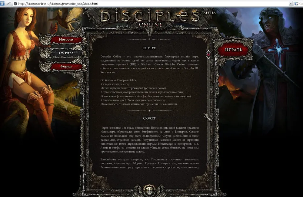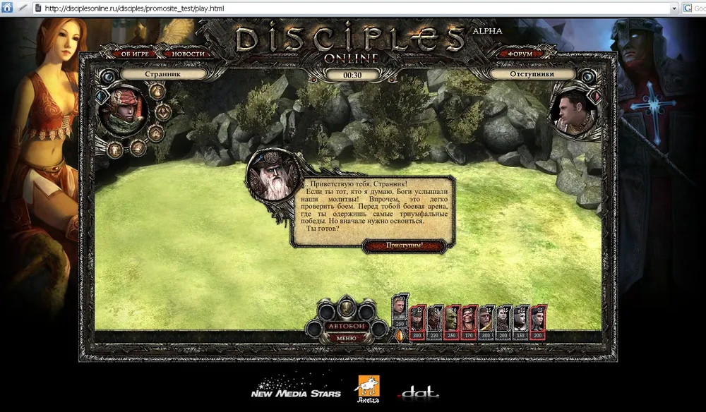 Собственно, это прелюдия к главному - методом научного тыка в комментах к прошлому посту был обнаружен сайт disciples-online.ru, а также родственные ему disciplesonline.ru и disciples-online.com, на которых можно посмотреть одним глазком на браузерных Дисов. Если лавочку все еще не прикрыли - сходите посмотрите, довольно красиво все. Если же прикрыли - вот небольшой фотоотчет. На сайте можно сыграть флешовый бой - по аналогии с другими браузерками, видимо, это помогает втянуться в игру. Довольно красивенько и удобно все.