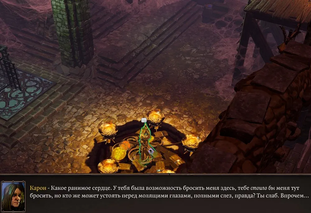Учёный помнил, что освобождённый Карон тотчас призовёт на помощь четырёх мёртвых спутников, и при помощи телепортации отправил их подальше, за решётки – чтобы не мешали. Потом установил среди светильников бочку с нефтью, валявшуюся неподалёку, и подорвал её. Затем… А затем всё пошло не так! Карон почему-то сделал первый ход – и в мгновение ока убил героя своими заклинаниями!