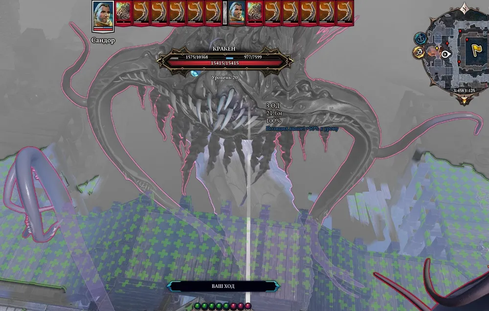 Бракк сделал первый ход? Ну и что? Этот идиот, вместо того, чтобы обрушить всю свою мощь на героя, убрался чёрт знает куда, предоставив возможность воевать другим. Сандор ушёл в невидимость и принялся ждать. Когда подошло время его второго хода, выпил зелёный чай, предоставленный госпожой Кемм и уменьшающий стоимость каждой атаки на две единицы, и забрался на площадку, где его не мог достать Кракен, но куда он мог телепортировать Бракка. (Чуть позже герой понял, что напрасно недооценил чай – можно было значительно облегчить многие поединки.)
