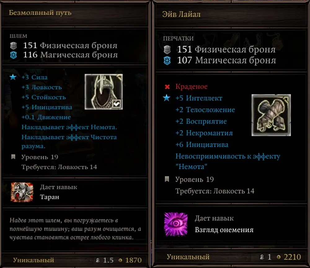 Поднявшись из подвала, заблокировал двойные двери, ведущие в приёмную; но не полностью – оставил проём для прыжков и телепортации. Поменял экипировку: надел шлем, дающий постоянную «Чистоту разума» в комплекте с «Немотой» и перчатки, блокирующие «Немоту». Ого! Неплохо!