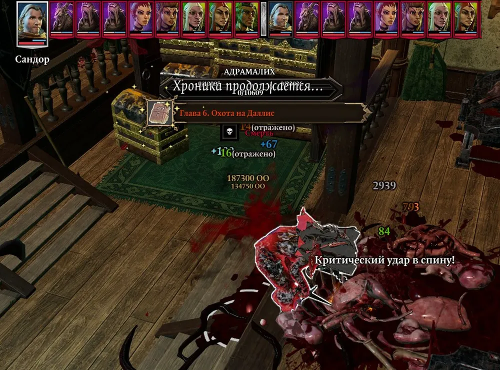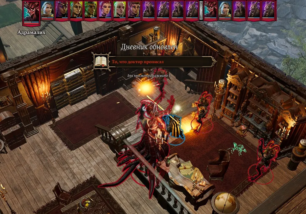 Адрамалих тупо разгуливал туда-сюда по своему дому и очень удивился, переместившись в комнату за преградой. Началась ювелирная работа: несколько ударов оружием, уход в тень и отбежать подальше: кто знает, какое заклинание может применить враг? Демон пытался подорвать трупы, да только Сандор заранее стащил их в один угол.