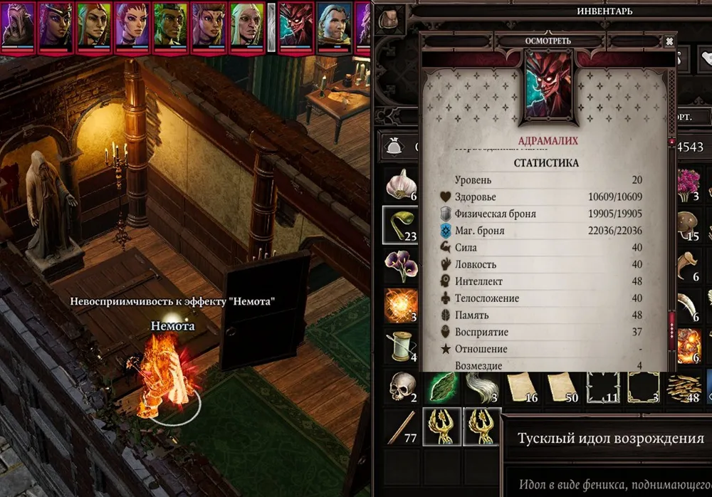Первым делом – перезарядить идолов возрождения, готово. Теперь – затушить огонь. Что за… Магия не работает! Вот тебе и раз! Картинки, отражающие сущность заклинаний, ярким светом сияют перед глазами учёного (не активные всегда были тускло-серыми), но заклинания не запускаются! «Немота»! «Немота» из шлема! Раздумывать было некогда, приходилось спасть свою шкуру; герой добежал до люка в подвал, но напоследок бросил взгляд на Адрамалиха, чтобы выяснить уровень его Восприятия – тридцать семь! Тридцать семь против восьмидесяти девяти! И демон пошёл первым!