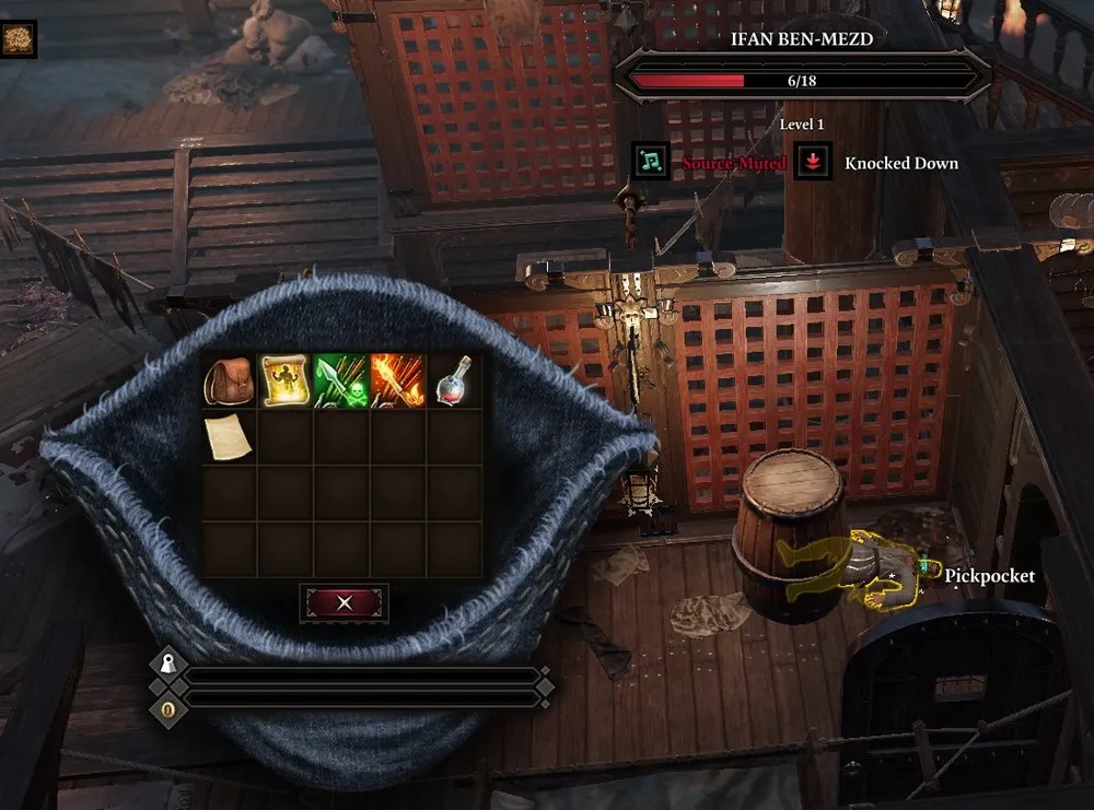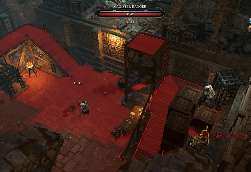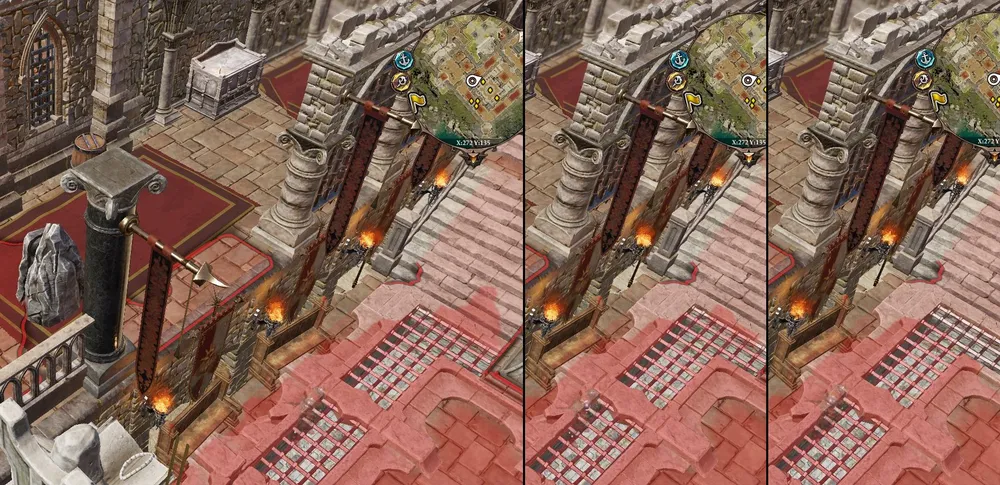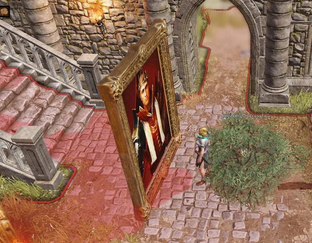 Клептоман в моём лице был одержим идеей ограбить стражников (они охраняют эльфийку, над которой проводят ритуал), но мешали пристальные взгляды троих магов, стоящих на возвышении. Предметы, повышающие способность скрытности, я отыскал уже после ухода с территории форта. Каково же было моё удивление, когда оказалось, что повышая скрытность, я всего лишь укорачиваю поле зрения врагов,