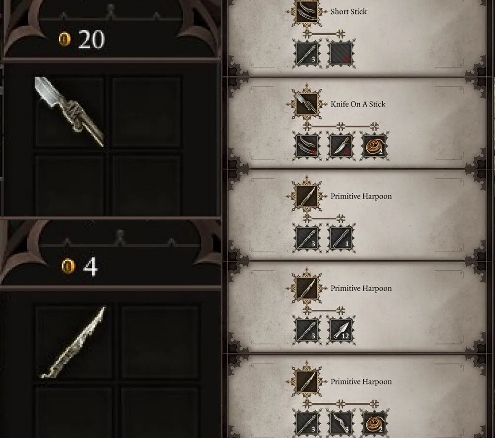 Зачем нужны сразу три рецепта примитивного гарпуна, если стоимость ингредиентов превышает стоимость готового изделия? (Ага, уже слышу: «Торговлю улучшай!». Согласитесь, что даже изначальная стоимость предмета - без улучшения способности торговли! – просто обязана хотя бы чуть – чуть быть выше стоимости ингредиентов, иначе его изготовление не имеет смысла.)