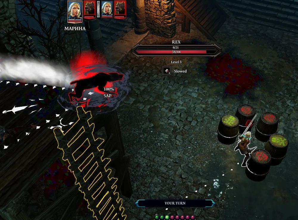 10.«Вот для чего нужны бочки! Правда, Бишоп всё равно сделает ход первым, как бы ни была высока инициатива героя («подарок» геймдизайнеров, ага), зайдёт под арку и применит лечение. Но взрывающиеся стрелы достанут его и там!»