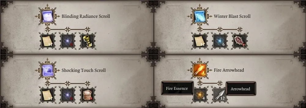 О том, что теперь нигде не найти взрывающихся стрел, я уже писал. Проблемой стали и огненные стрелы: их крайне мало, а сделать самому… Почему бы и нет? Тем более, что в игре появилось много различных рецептов. Слишком много… А уж рецептурный раздел, с моей точки зрения, не выдерживает критики.