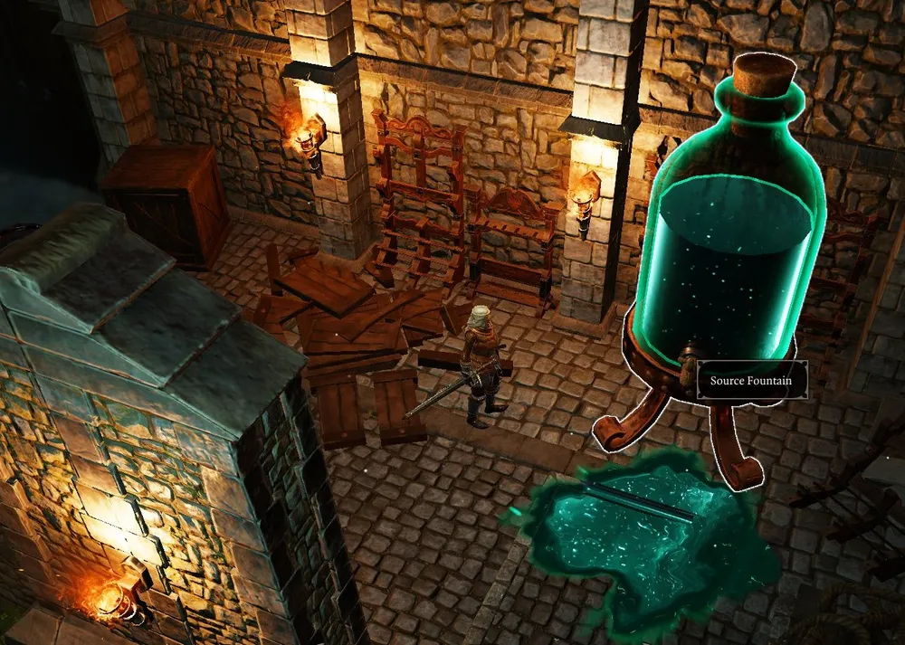 Вернули «лужицы», позволяющие заряжаться магией источника. По крайней мере, в двух местах: неподалёку от горящих свинок (что странно – «самогонная бутыль» рядом!)