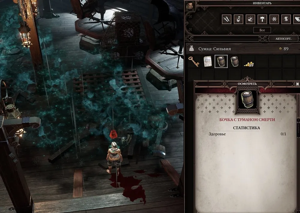 (Если кому-то всё же удалось взять три бочки – напишите – как?) Но герой, стоящий на самом краю смертельного облака не может сдвинуться с места. «Телекинез», переставляю одну бочку ближе к дверям и… Загружаю игру, повторяю – с тем же результатом! Да что за?!