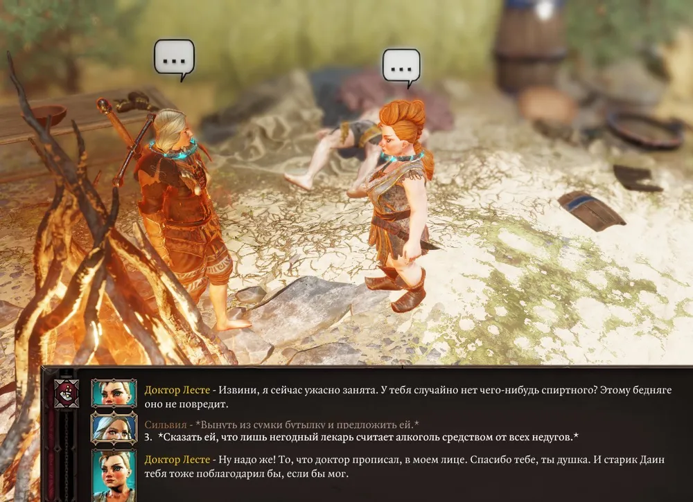 Я не советую давать врачу алкоголь: Даин напьётся до потери памяти, разбудить его не удастся; квест на получение выигрышной карты – чтобы наказать картёжников на стене – будет невозможно выполнить.