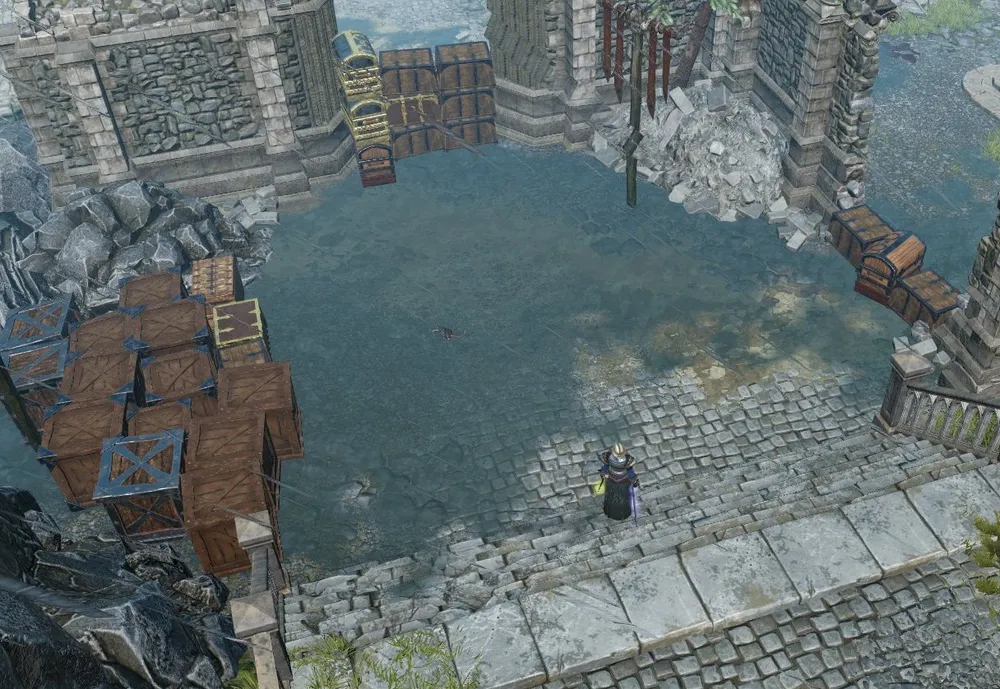 Нет, я не согласен на одну бочку! Взял в рюкзак сундук, подхватил обе бочки и загрузил в него. Затем выложил сундук наружу и принялся «кантовать» к лестнице. Спустился, поставил внизу рядом с лестницей второй сундук и переставил бочки в него.